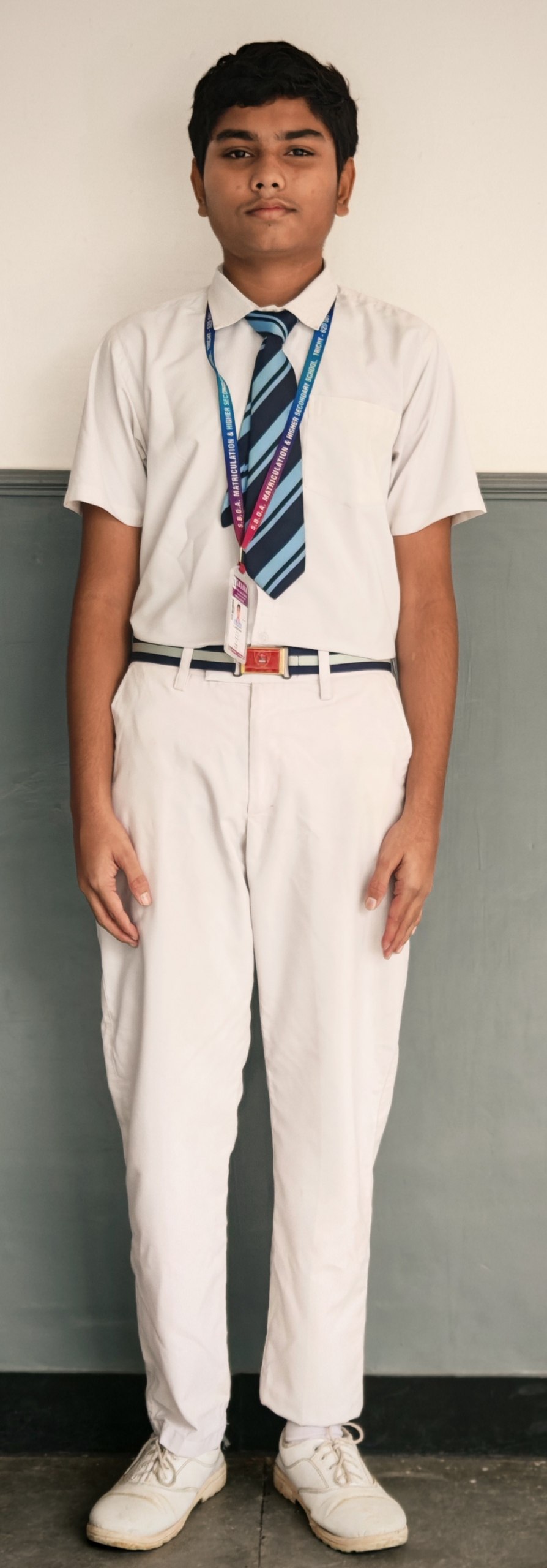 Boys L K G & U K G White shirt and white half pant with a navy blue 1 cm bands on the hem of sleeve. Belt, tie, navy blue socks and black slip-on (cut shoes). |